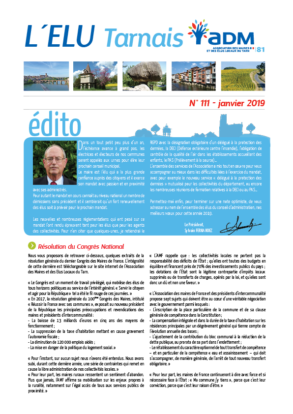 Dans un tout petit peu plus d’un an, l’échéance avance à grand pas, les électrices et électeurs de nos communes seront appelés aux urnes pour élire leur prochain conseil municipal. Le maire est l’élu qui a la plus grande confiance auprès des citoyens et il exerce son mandat avec passion et en proximité avec ses administrés. Pour autant le mandat en cours connaît au niveau national un nombre de démissions sans précédent et il semblerait qu’un fort renouvellement des élus soit à prévoir pour le prochain mandat. Les nouvelles et nombreuses règlementations qui ont pesé sur ce mandat l’ont rendu prouvant tant pour les élus que pour les agents des collectivités. Pour n’en citer que quelques-unes, je retiendrai le RGPD avec la désignation obligatoire d’un délégué à la protection des données, la DECI (Défense extérieure contre l’incendie), l’obligation de contrôle de la qualité de l’air dans les établissements accueillant des enfants, le PAS (Prélèvement à la source)… L’ensemble des services de l’Association a mis tout en oeuvre pour vous accompagner au mieux dans les difficultés liées à l’exercice du mandat, avec pour exemple le nouveau service « délégué à la protection des données » mutualisé pour les collectivités du département, ou encore les nombreuses réunions de formation relatives à la DECI ou au PAS… Permettez-moi enfin, pour terminer sur une note optimiste, de vous adresser au nom de l’ensemble des élus du conseil d’administration, nos meilleurs voeux pour cette année 2019.
